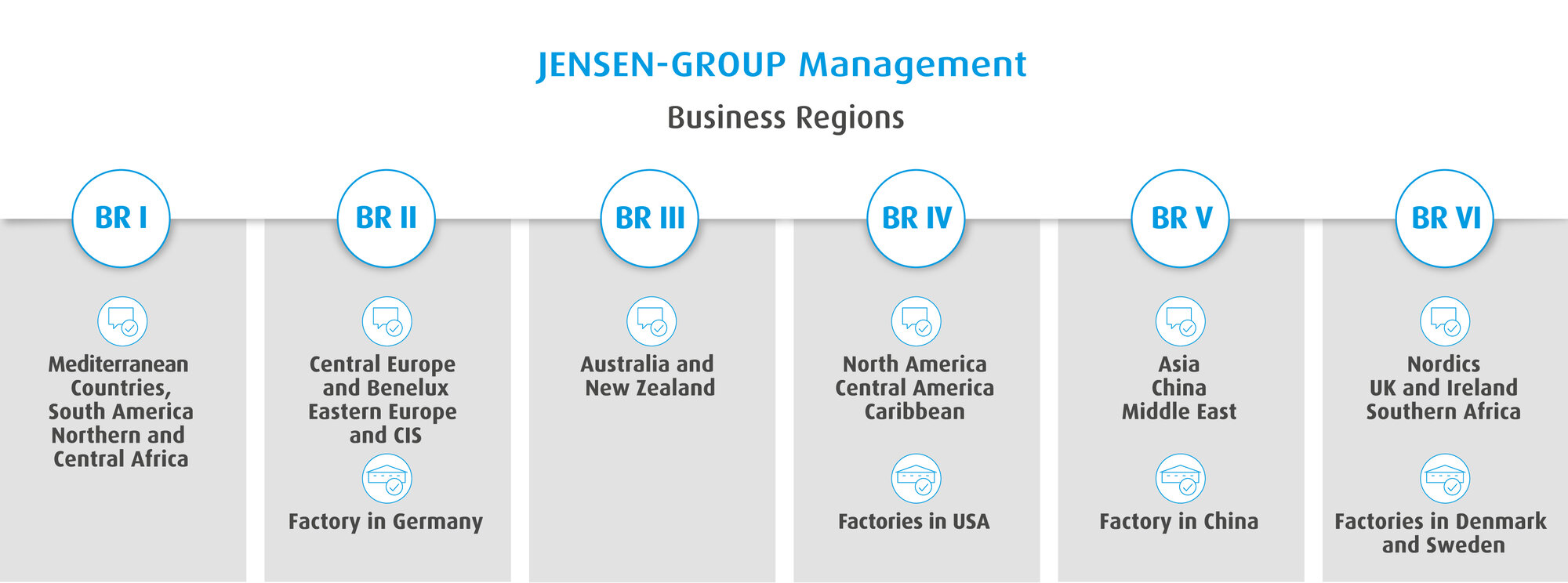 JENSEN-GROUPは6つのビジネスリージョンで構成されます。各ビジネスリージョンは流通と生産を担当し、グループが設計、製造するすべての製品に責任を負っています。各ビジネス・リージョンの工場はJENSEN-GROUPの製品を開発、生産し、セールス&サービス・センター(SSC)と正規代理店の世界的ネットワークを通じ、競争力のある幅広い製品群をお届けしています。